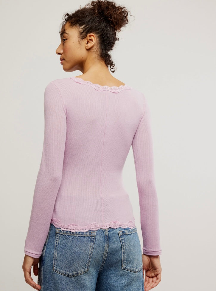 Features: Soft ribbed fabrication, V-neckline, button-front closure, lace trim, rounded hem