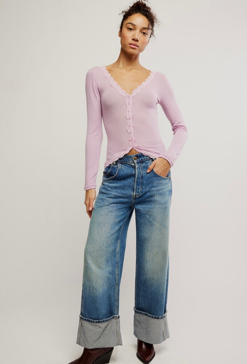 Achieve effortless style in this comfy cardi from Intimately, featured in a soft ribbed fabrication with lacy trim and dainty button closure.
