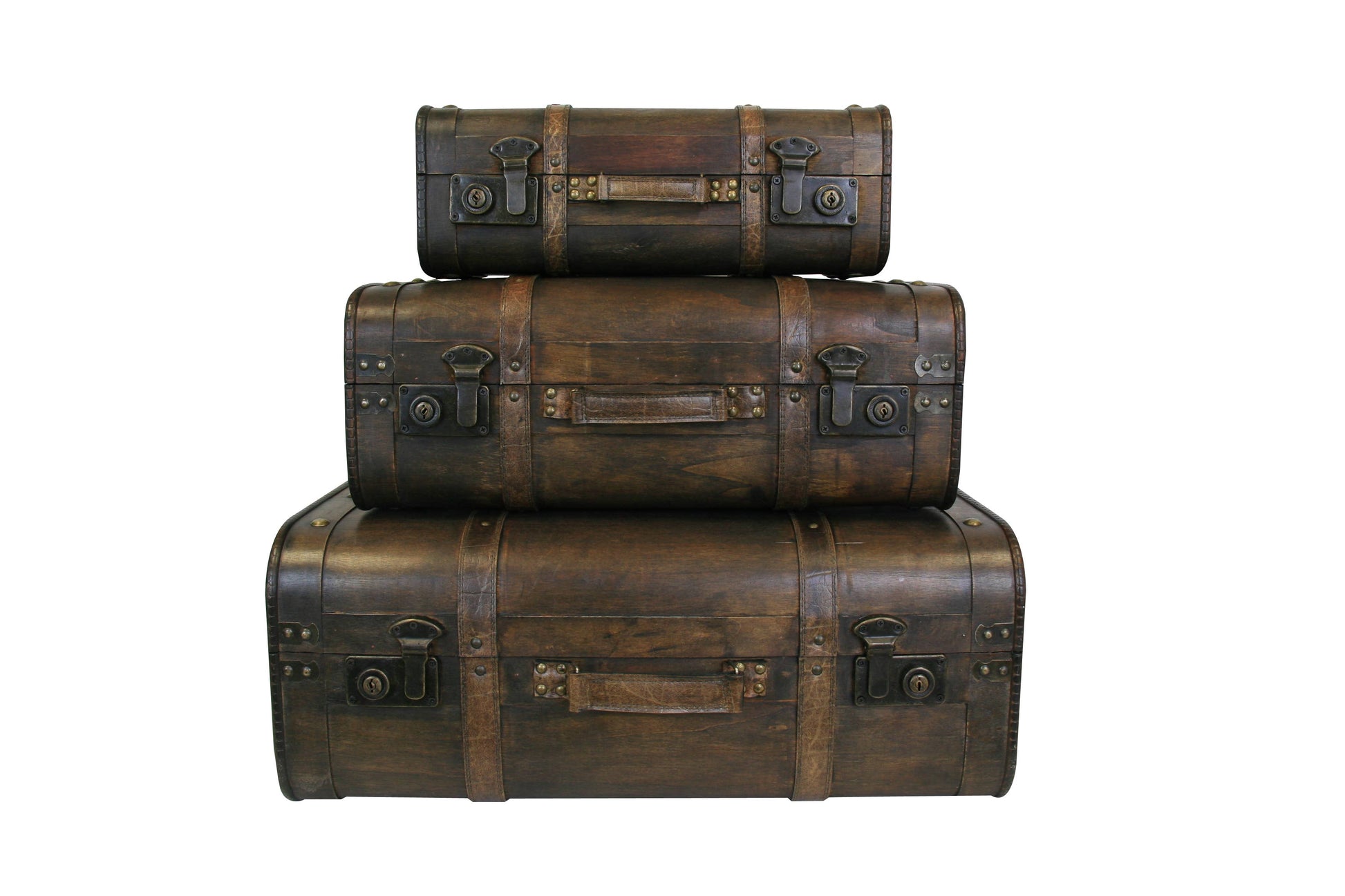 Store your special treasures, keepsakes, and collectibles in style with this charming wood dome-shaped trunk box set. Crafted with a vintage aesthetic, these wooden trunks feature an antique finish with metal accents, adding a touch of rustic elegance to any space. The set includes three boxes, each in a different size, designed to stack neatly or stand individually to complement your decor. Ideal for organizing and storing a variety of items, from jewelry and memorabilia to arts and crafts supplies, these trunks provide a functional and stylish solution to help you de-clutter your space. Built with durable wood and reinforced with leather straps and metal latches, they offer both aesthetic appeal and practical storage, making them perfect for tidying up your home or workspace. Whether displayed in a living room, bedroom, or office, this set brings both organization and a timeless, rustic look to your interior. L: 9.5 x 23.5 x 14.25 in M: 7.5 x 19.75 x 11.5 in S: 6 x 15.75 x 9 in