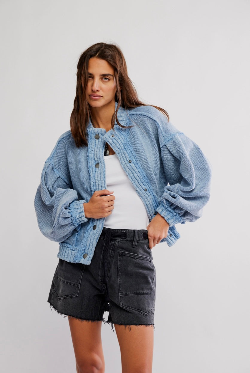 Cozy and classic, this cardi from our We The Free collection features a soft terry fabrication and slouchy silhouette with billowy drop-shoulder sleeves and front patch-pockets.