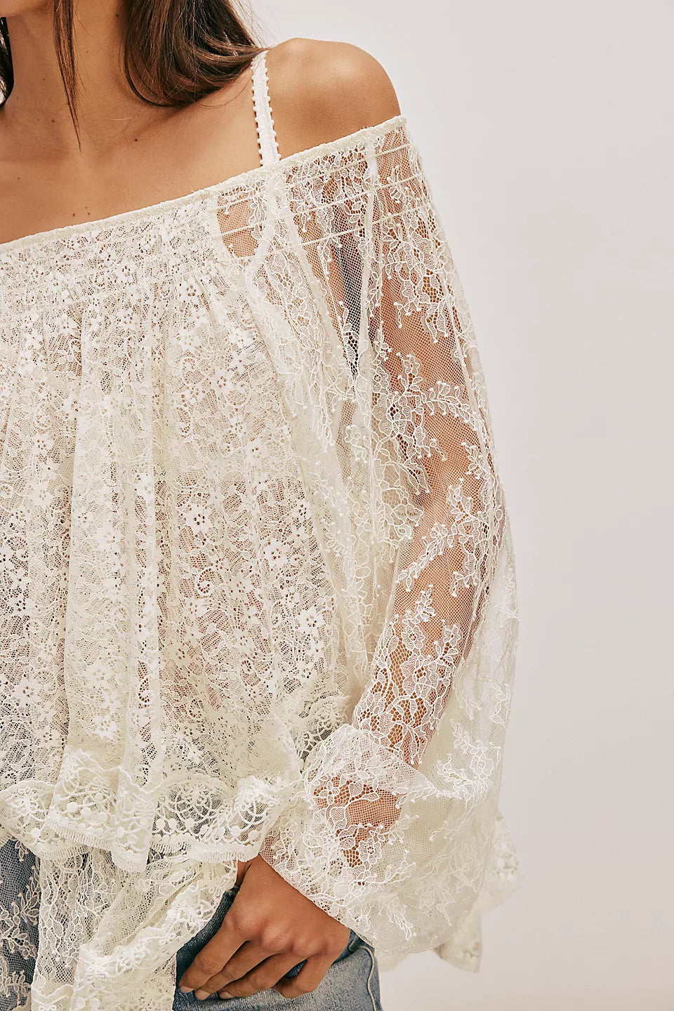 Features: Sheer lace fabrication, off-the-shoulder neckline, balloon sleeves with elasticated cuffs, self-tying back closures, layered design with contrast trim, unlined