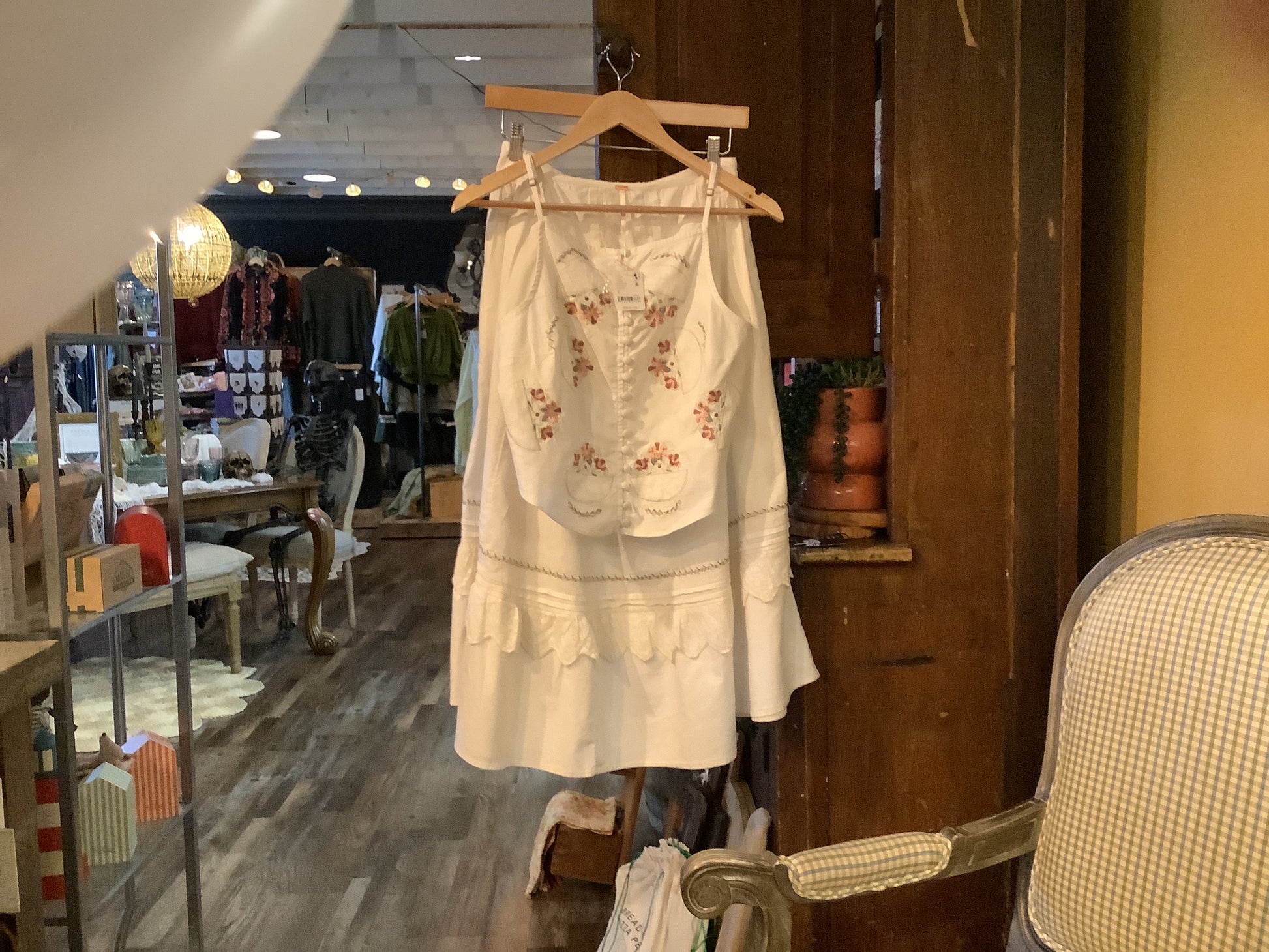 Beautiful minimal coverage handkerchief style crop top with covered buttons down the front and spaghetti straps with floral embroidery throughout. Maxi skirt with layered ruffles along the bottom and embroidery details.