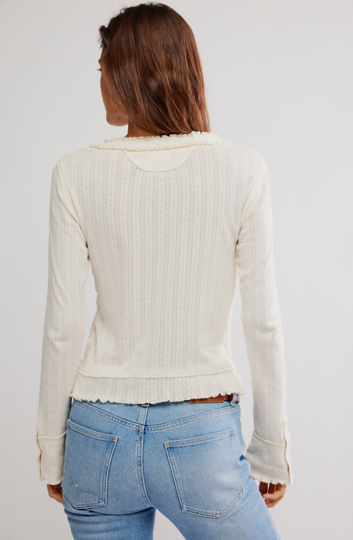 So sweet from our We The Free collection, this long-sleeve tee features a soft pointelle fabrication and relaxed fit with contrast embroidered detailing and a scoop-neckline.